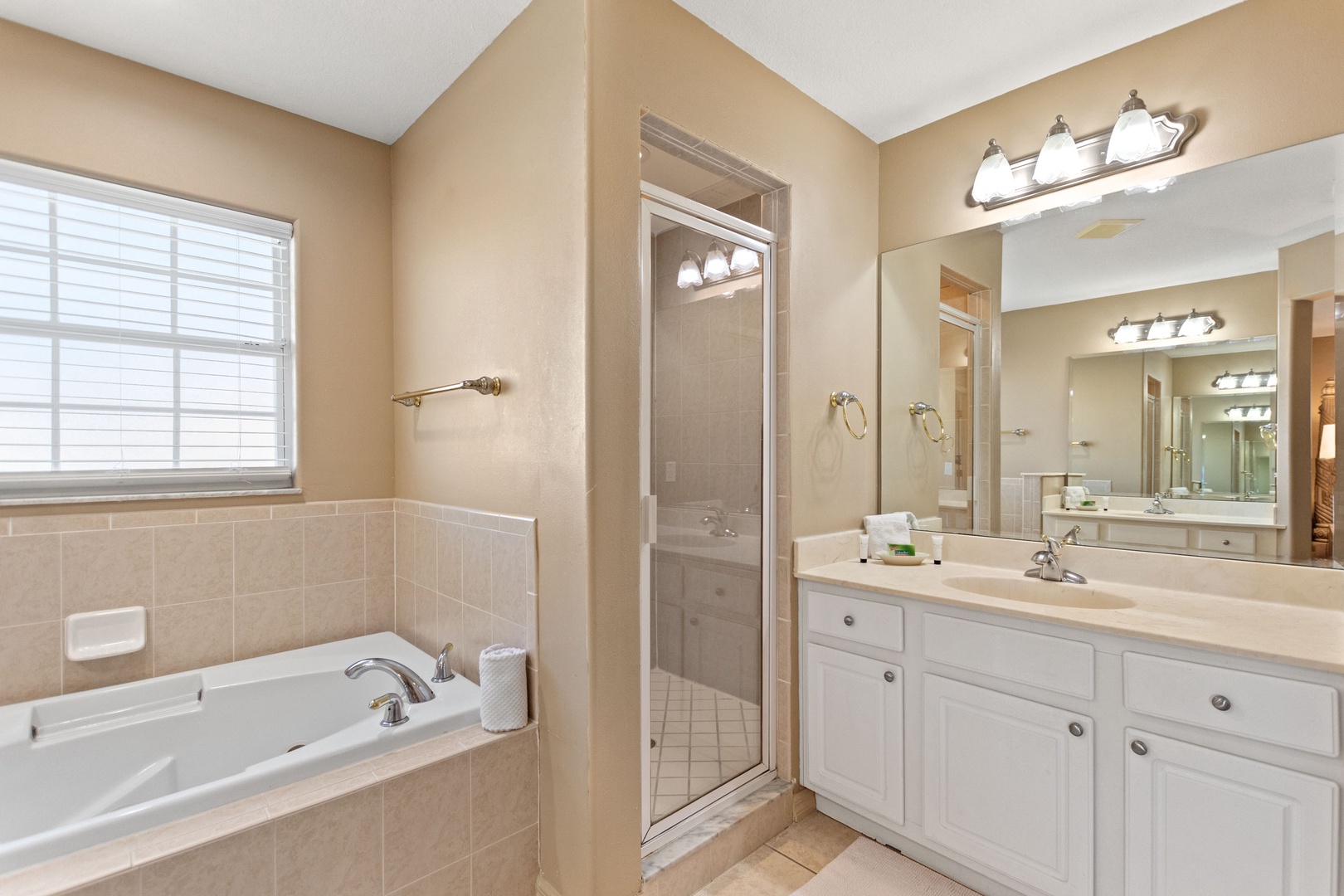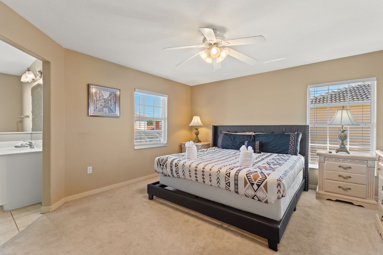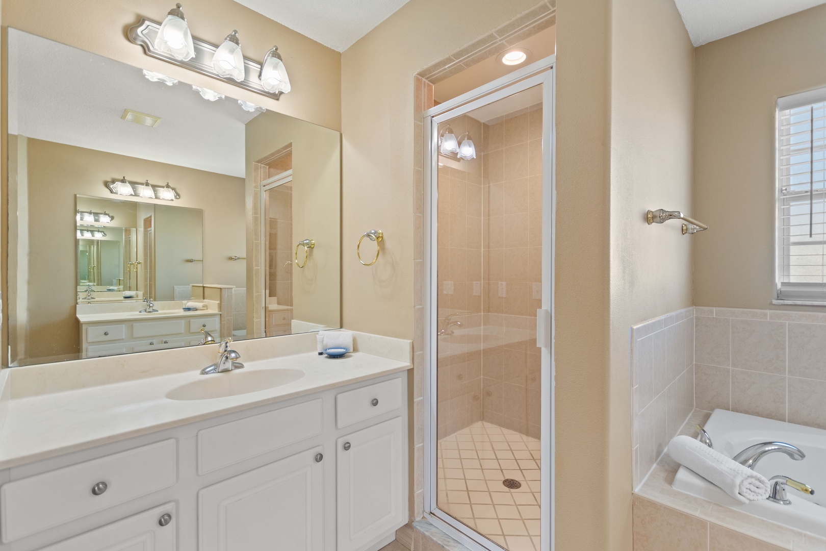 Bedroom 1 – King Master Suite (Sleeps 2): Ensuite with walk-in shower, garden tub, and dual vanities.