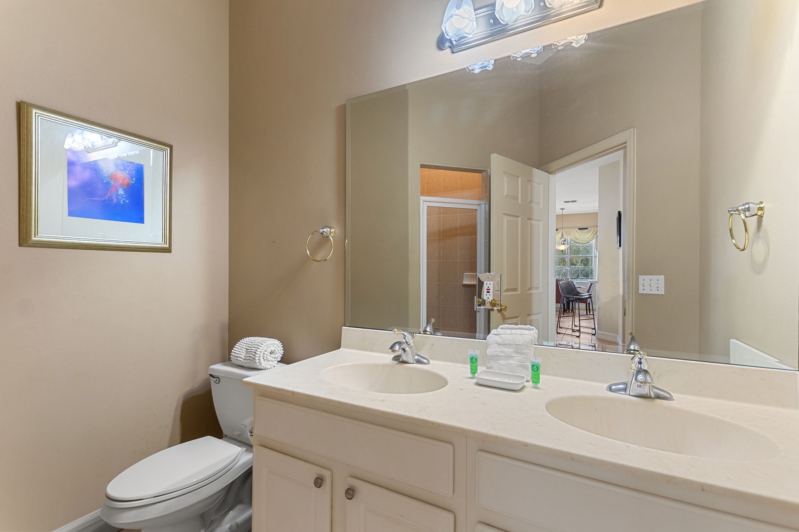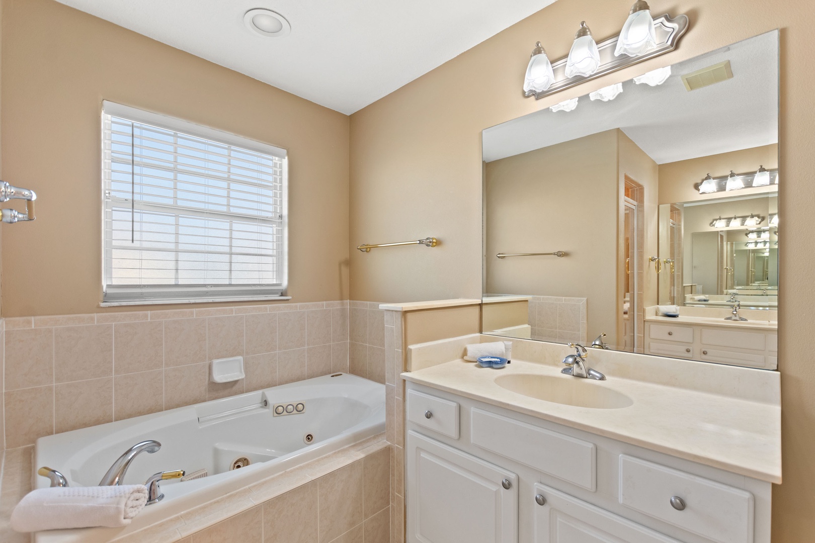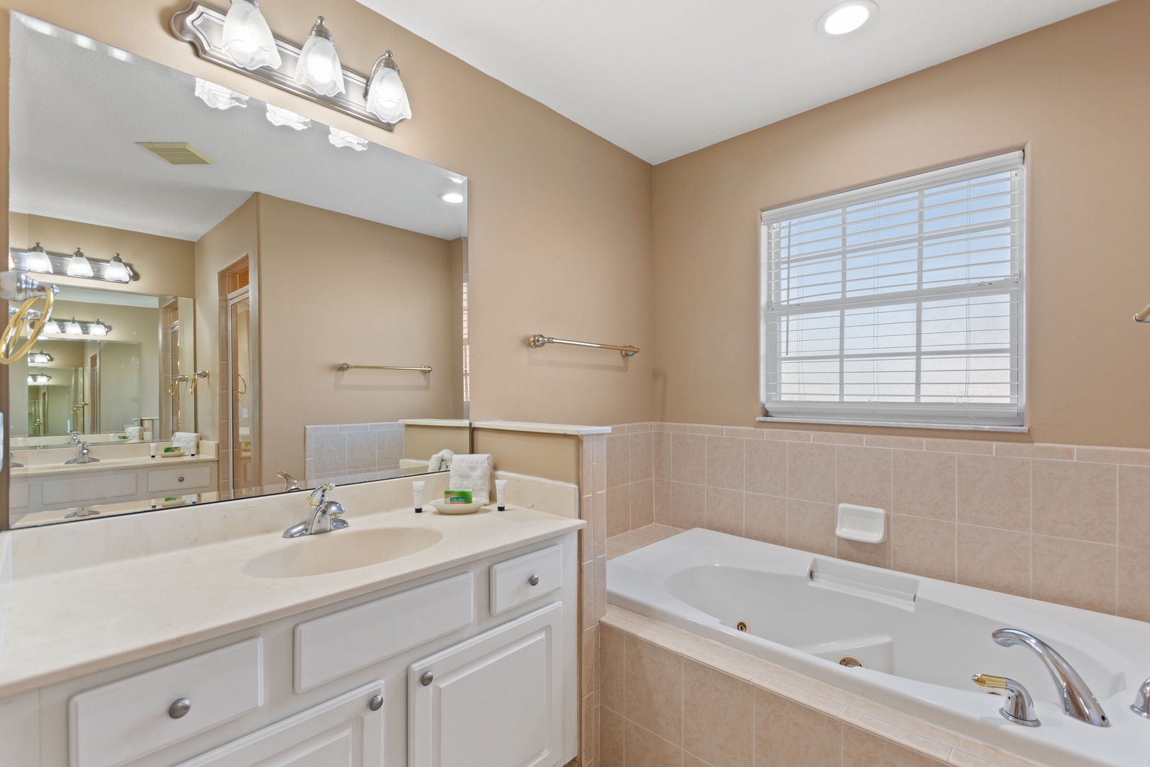 Bedroom 1 – King Master Suite (Sleeps 2): Ensuite with walk-in shower, garden tub, and dual vanities.