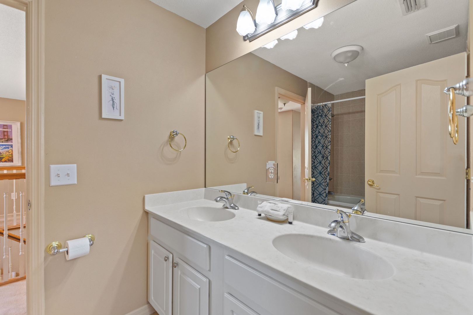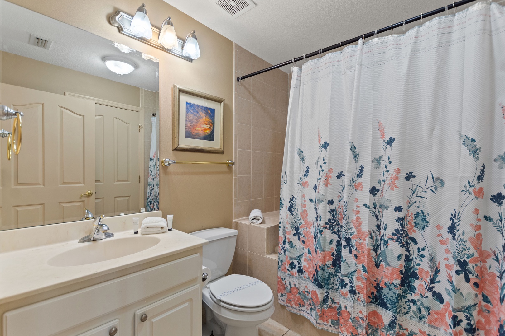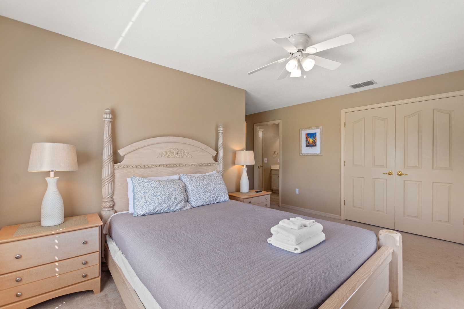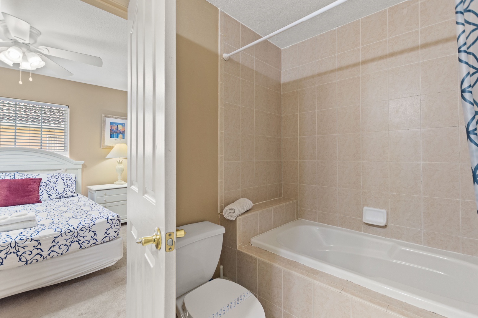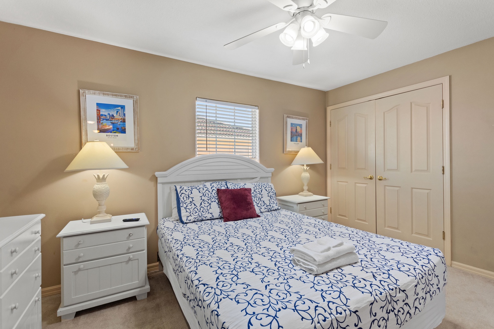 Bedroom 3 – Queen Bedroom (Sleeps 2): Direct access to a family bathroom with shower over tub.