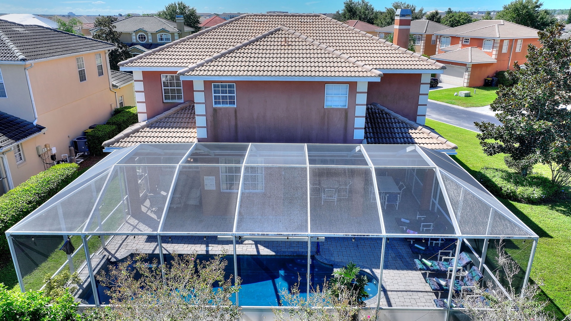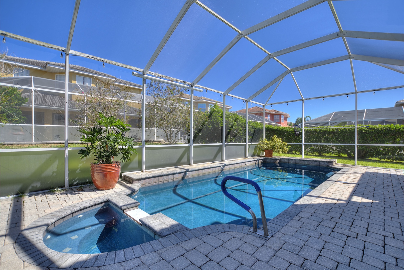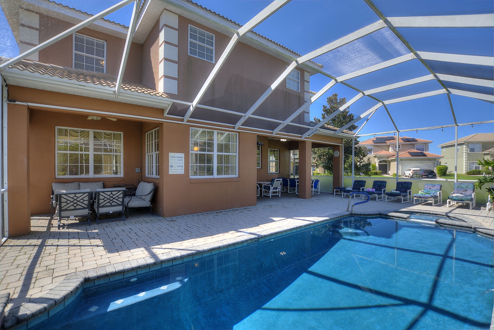 Private South-Facing Pool and Spa: Screened-in, with plenty of chairs, loungers, and outdoor dining table.