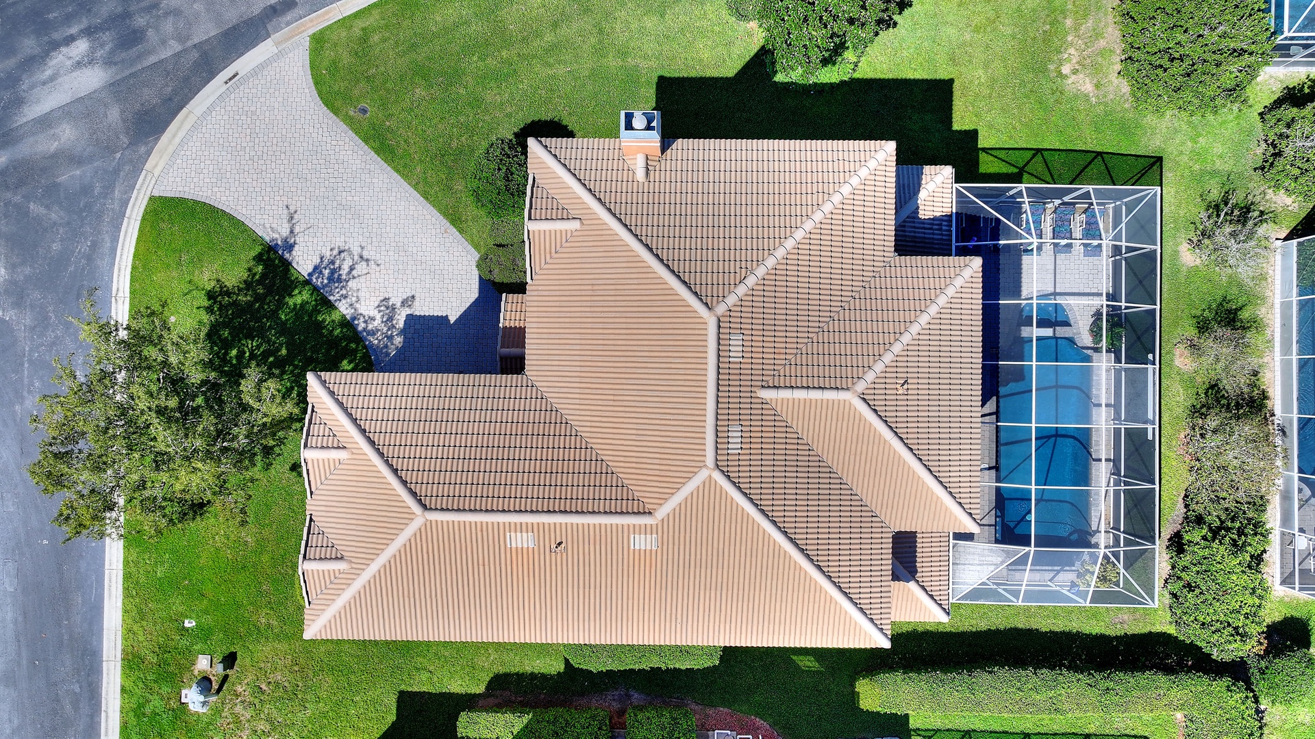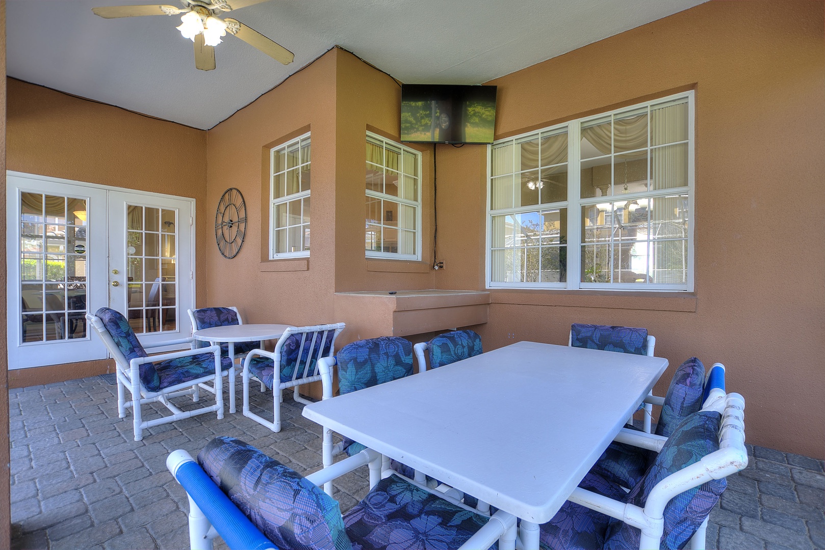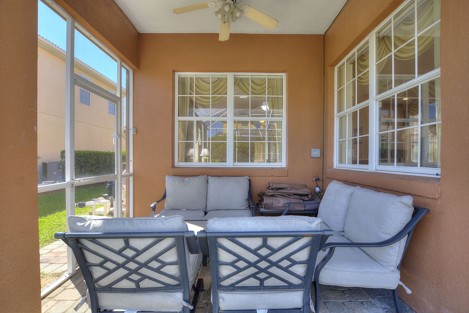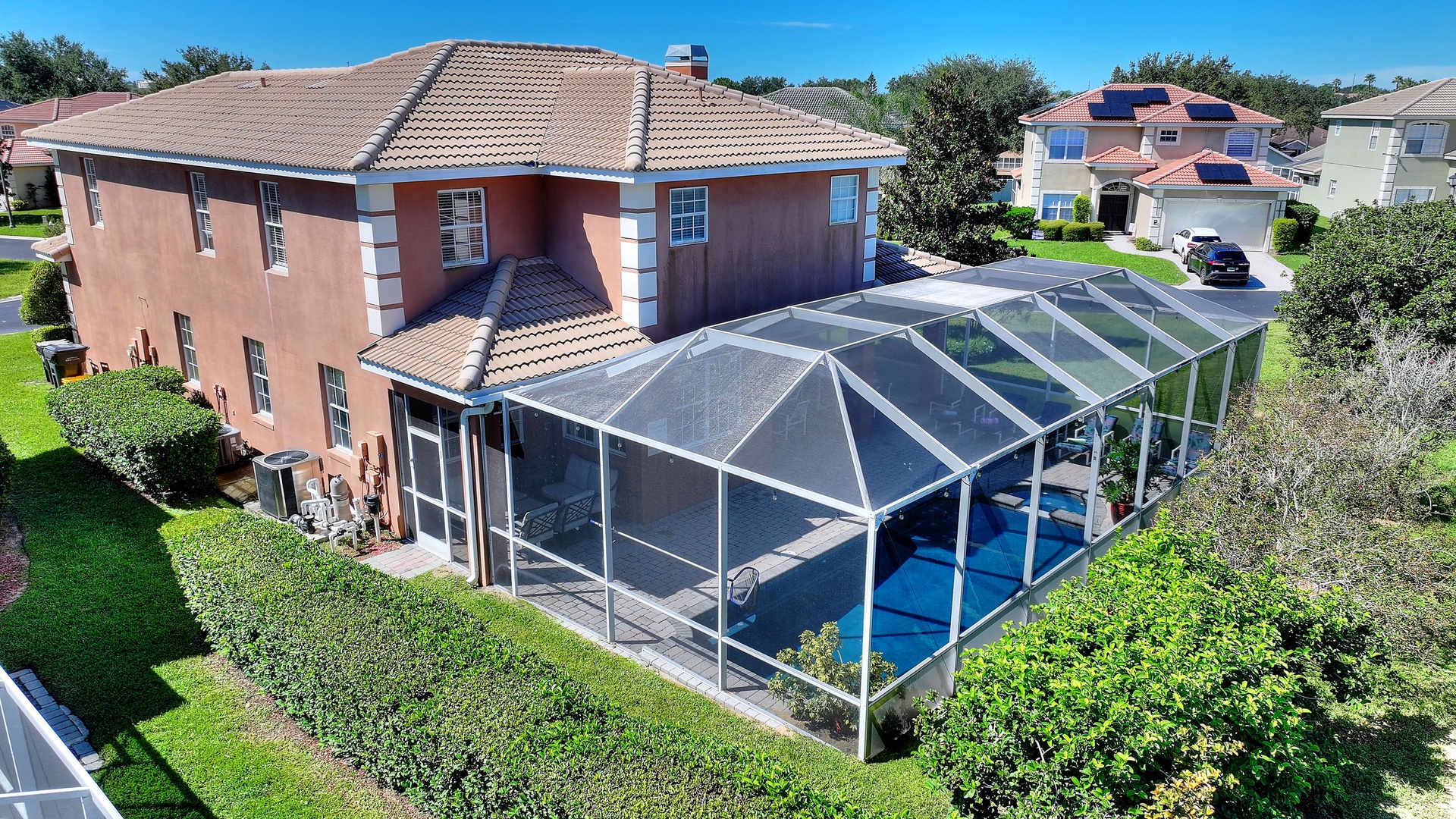 Private South-Facing Pool and Spa: Screened-in, with plenty of chairs, loungers, and outdoor dining table.