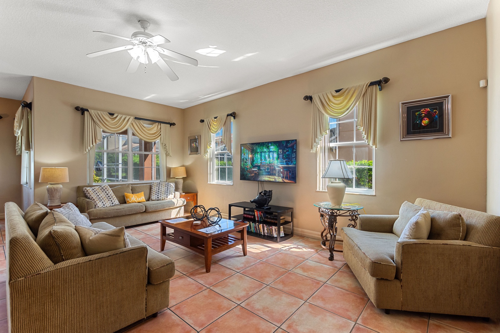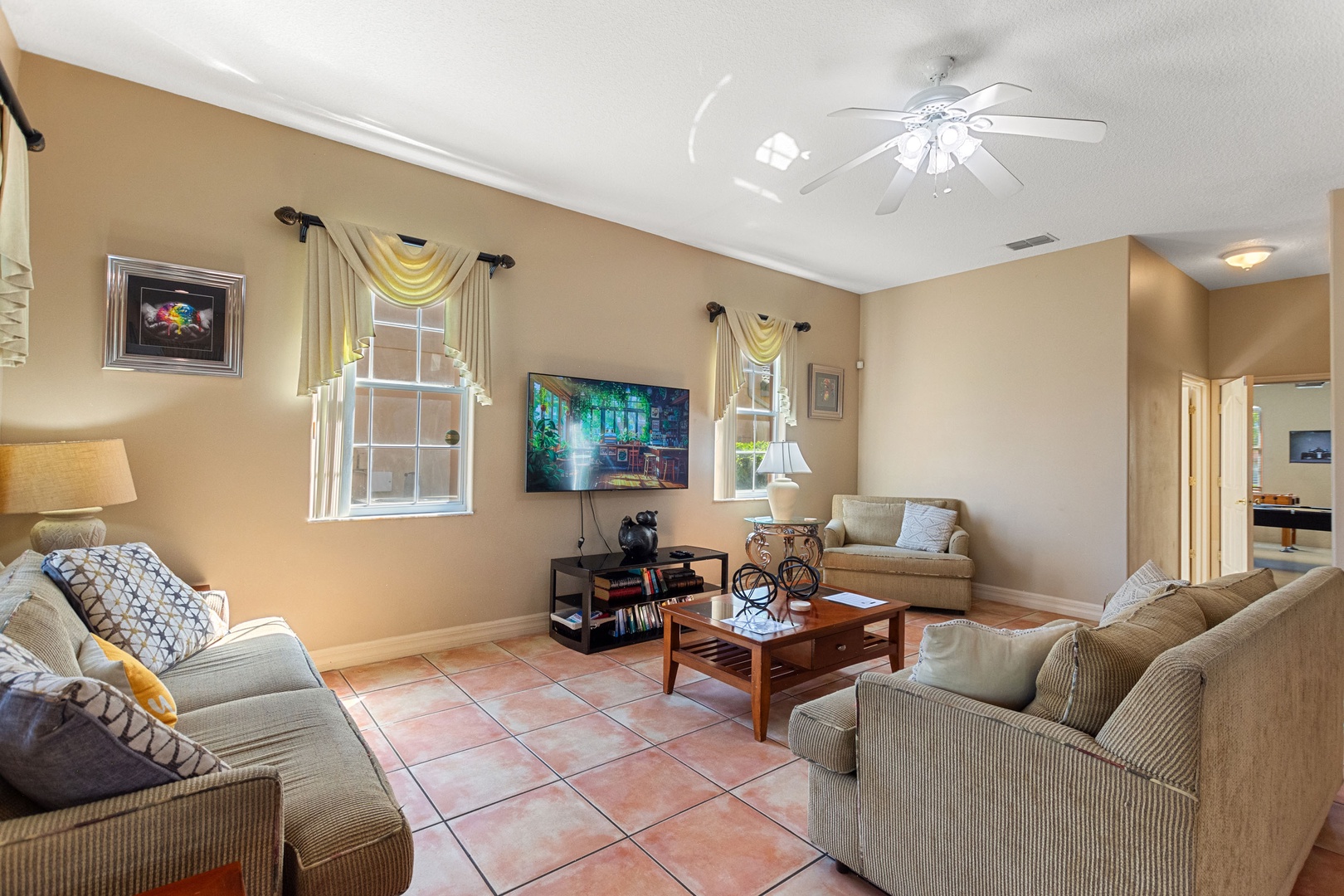 Main Lounge: Open-plan living with comfortable seating, large Smart TV, and direct pool access.
