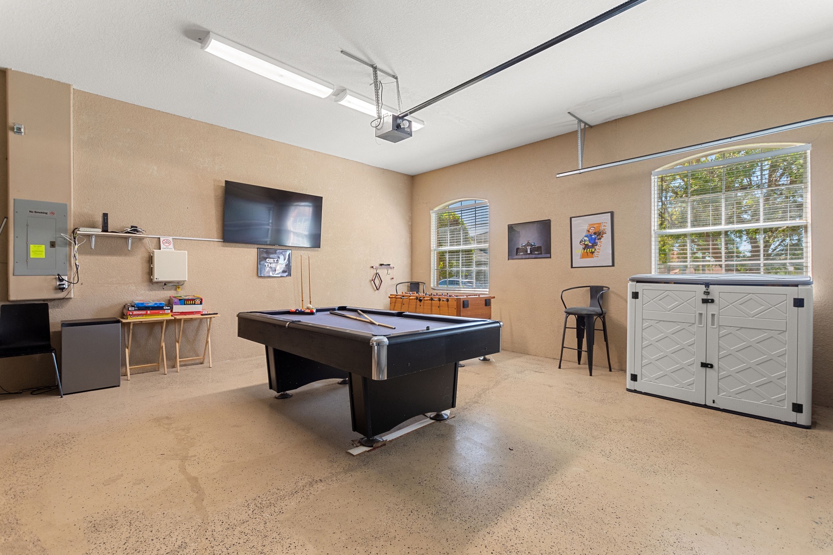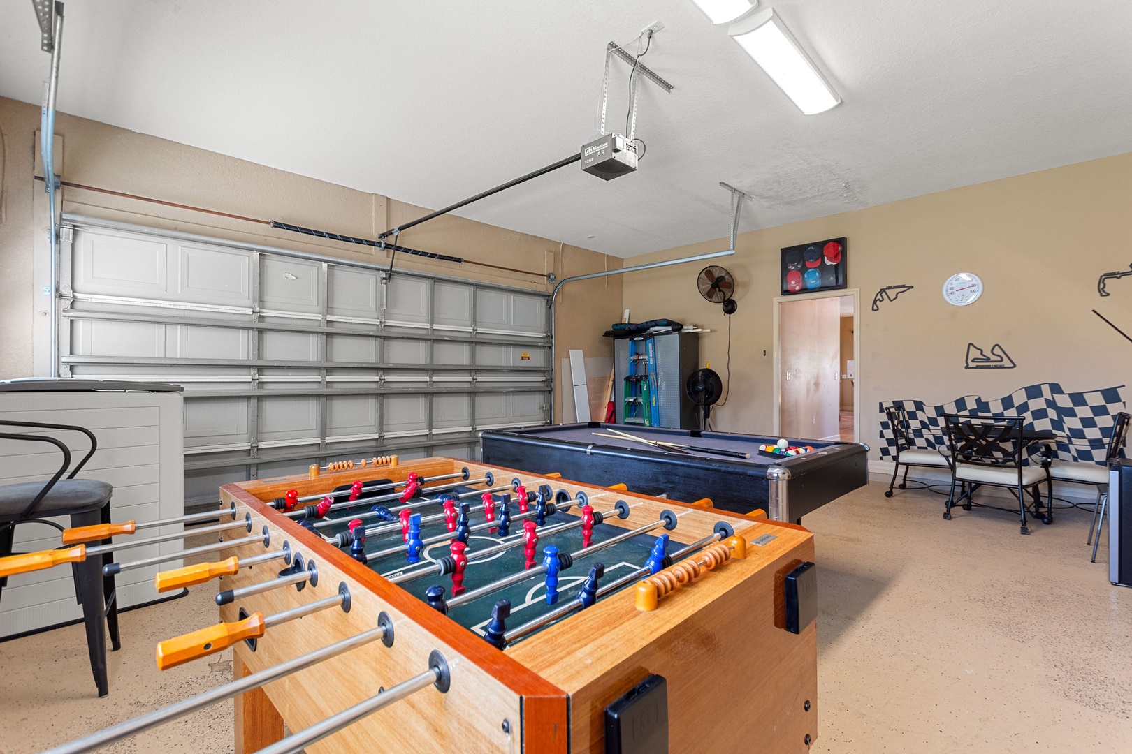 Games Room: Foosball and pool table in the converted garage, fun for all ages.
