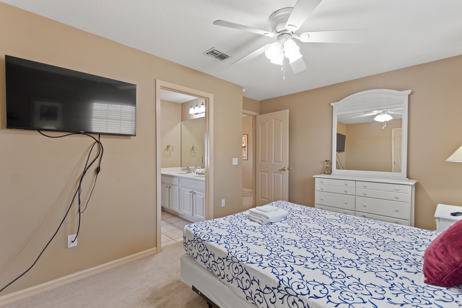 Bedroom 4 – Queen Bedroom (Sleeps 2): Direct access to a second family bathroom with shower over tub.
