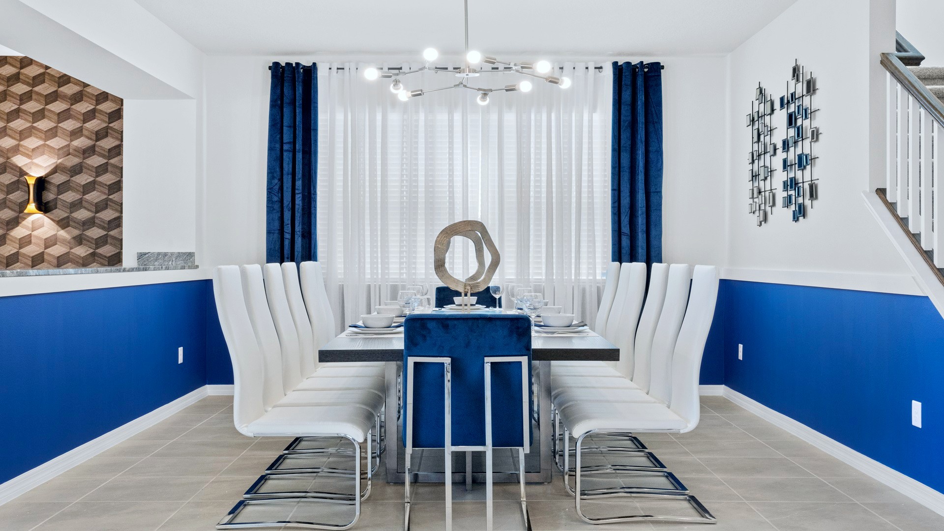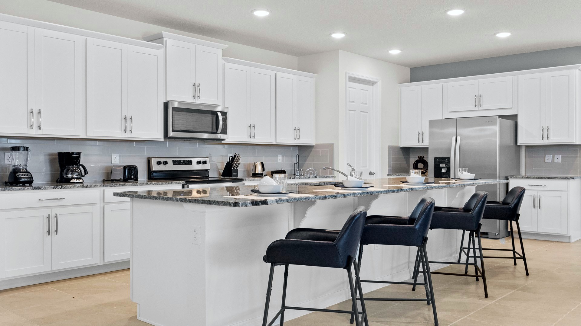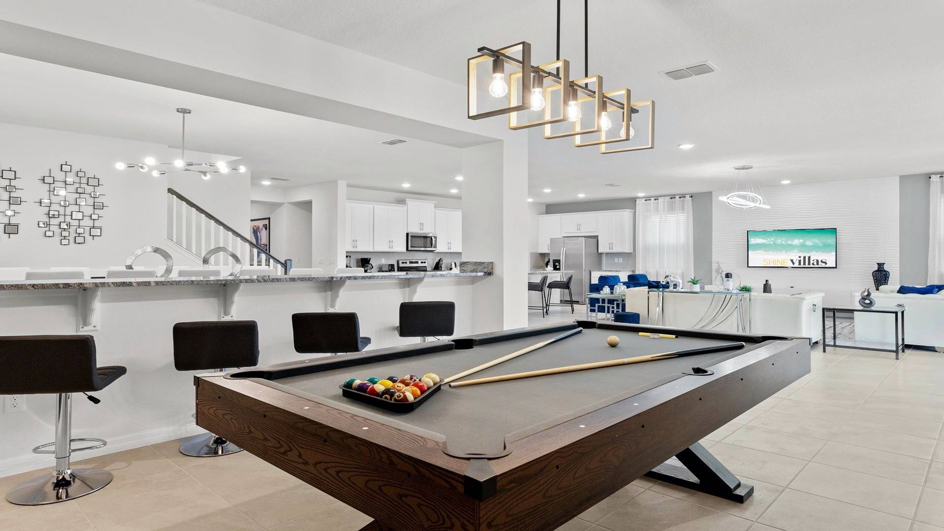 Dining Areas: Large dining table, breakfast bar seating, outdoor dining near the pool.