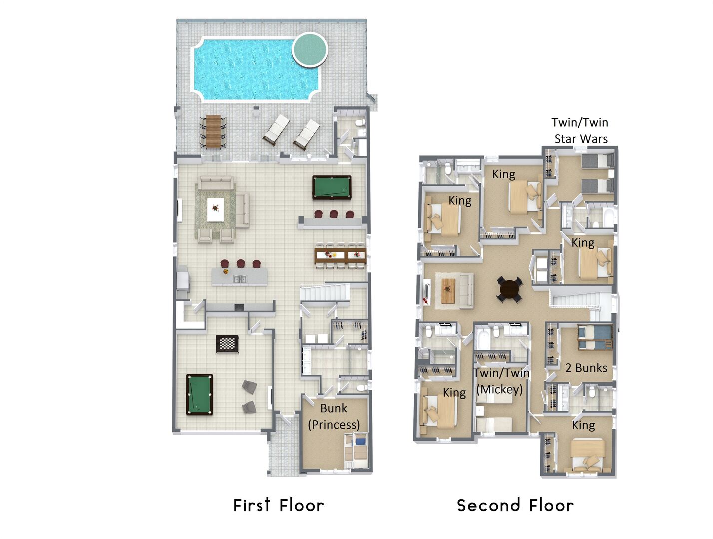 Themed Bedrooms: Princess Castle, Star Wars, Mickey and Minnie, Moana Lodge, and more.