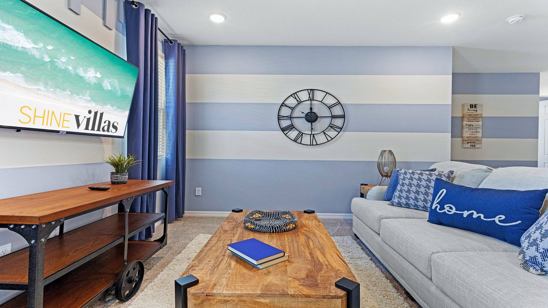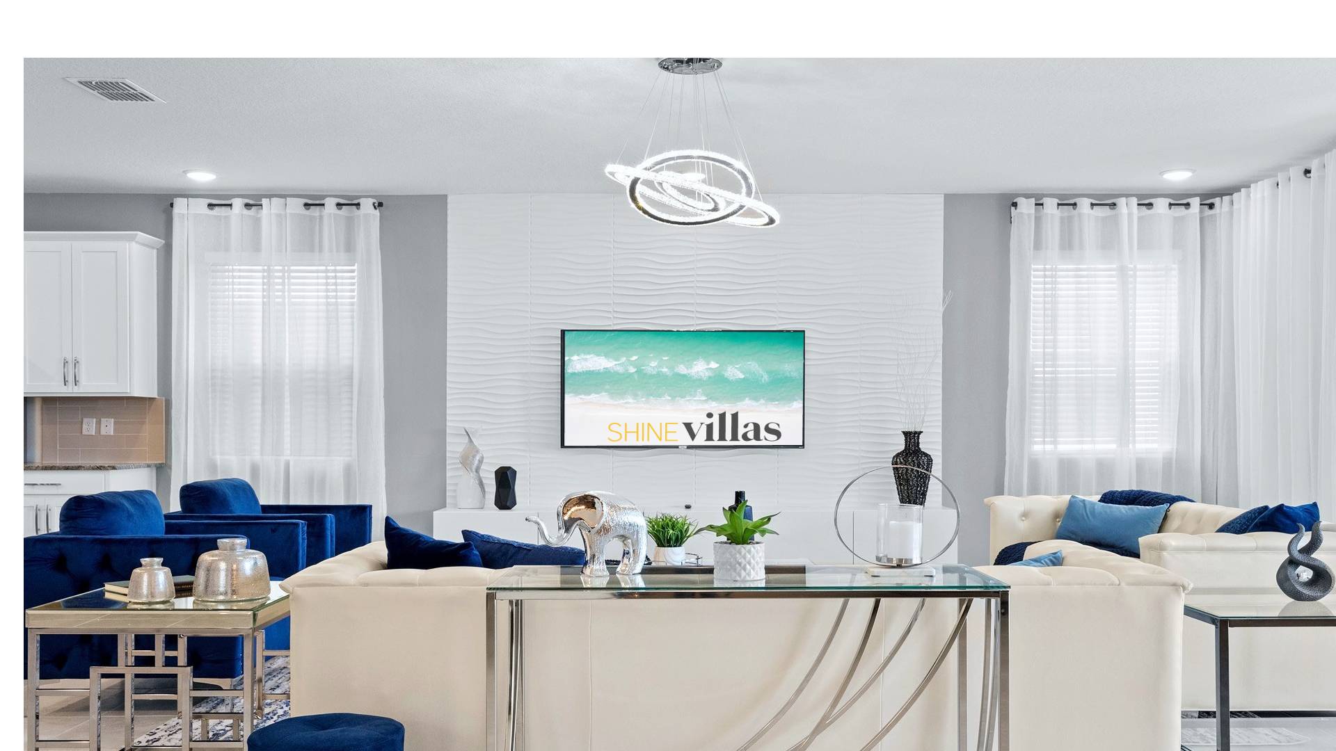 Main Living Area: Open-concept with comfortable seating, large Smart TV, dining area, and direct pool access.
