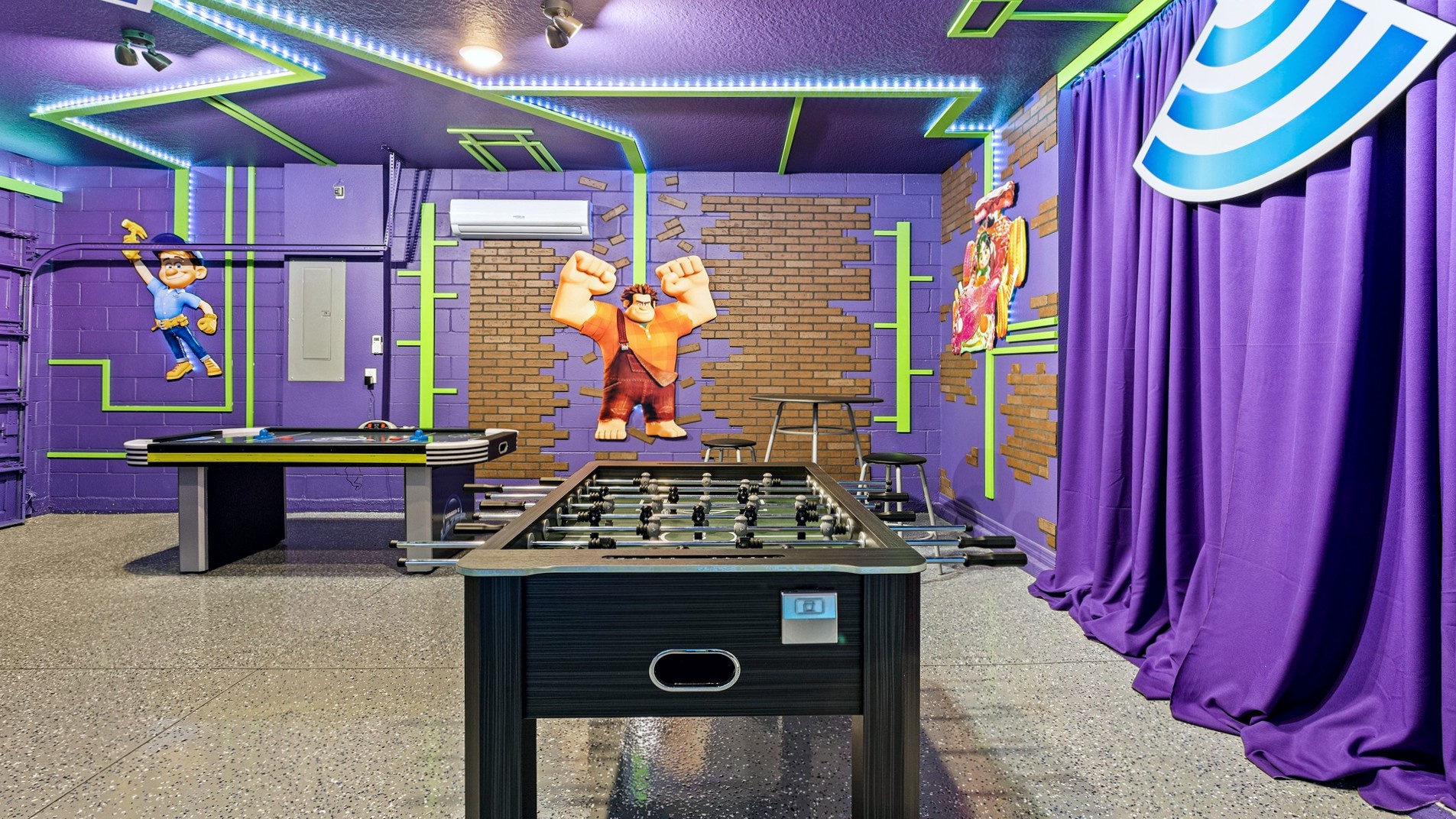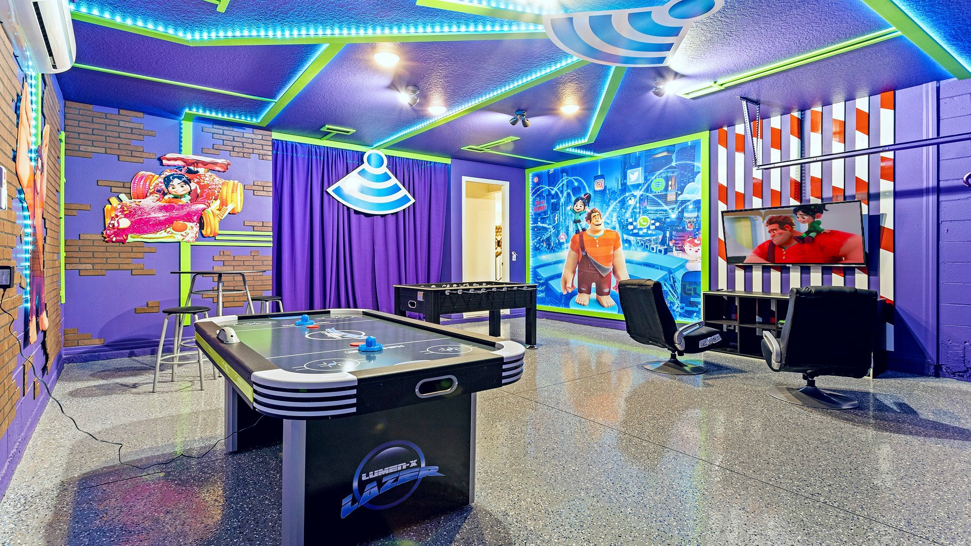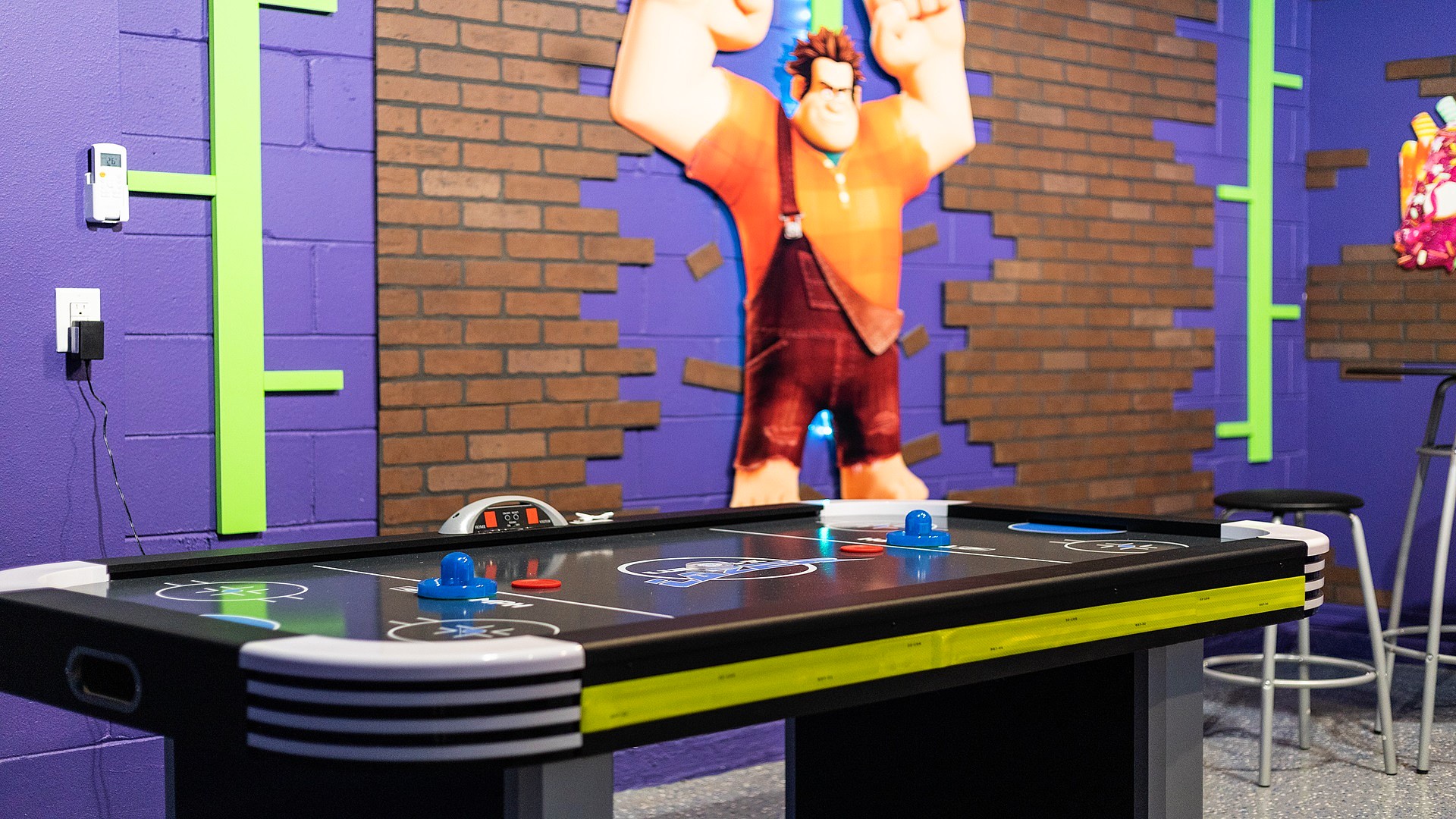 Air-Conditioned Game Room: Wreck-It Ralph theme with air hockey, foosball, and gaming area.