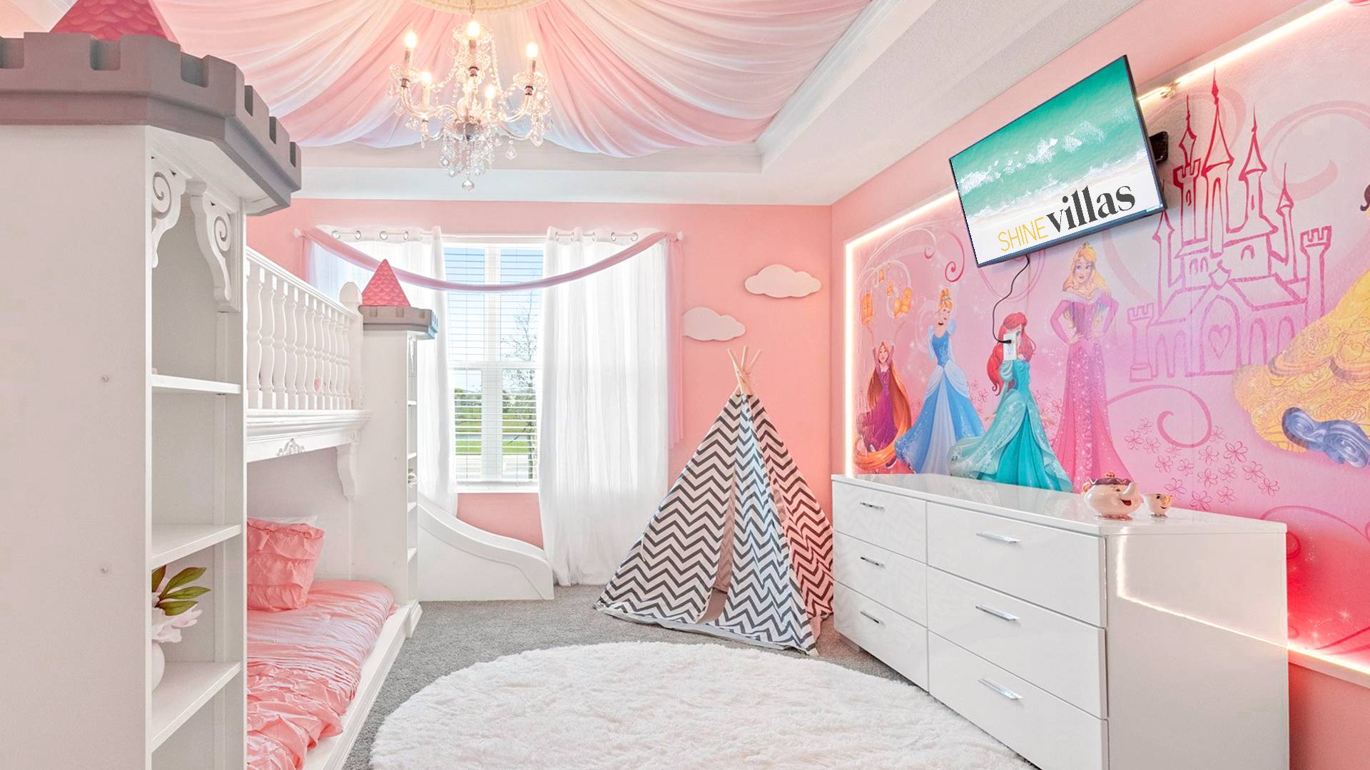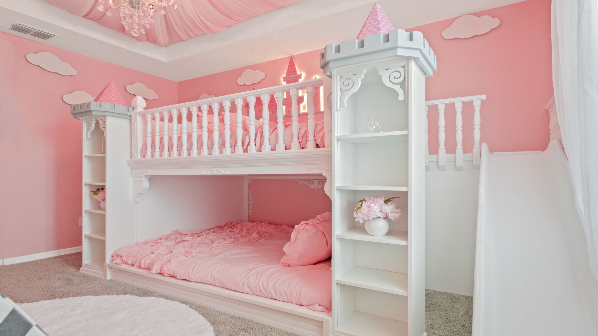Princess Paradise (Sleeps 4): 2 Full Beds (Princess Castle theme, with slide), en-suite bath, large walk-in shower and closet.