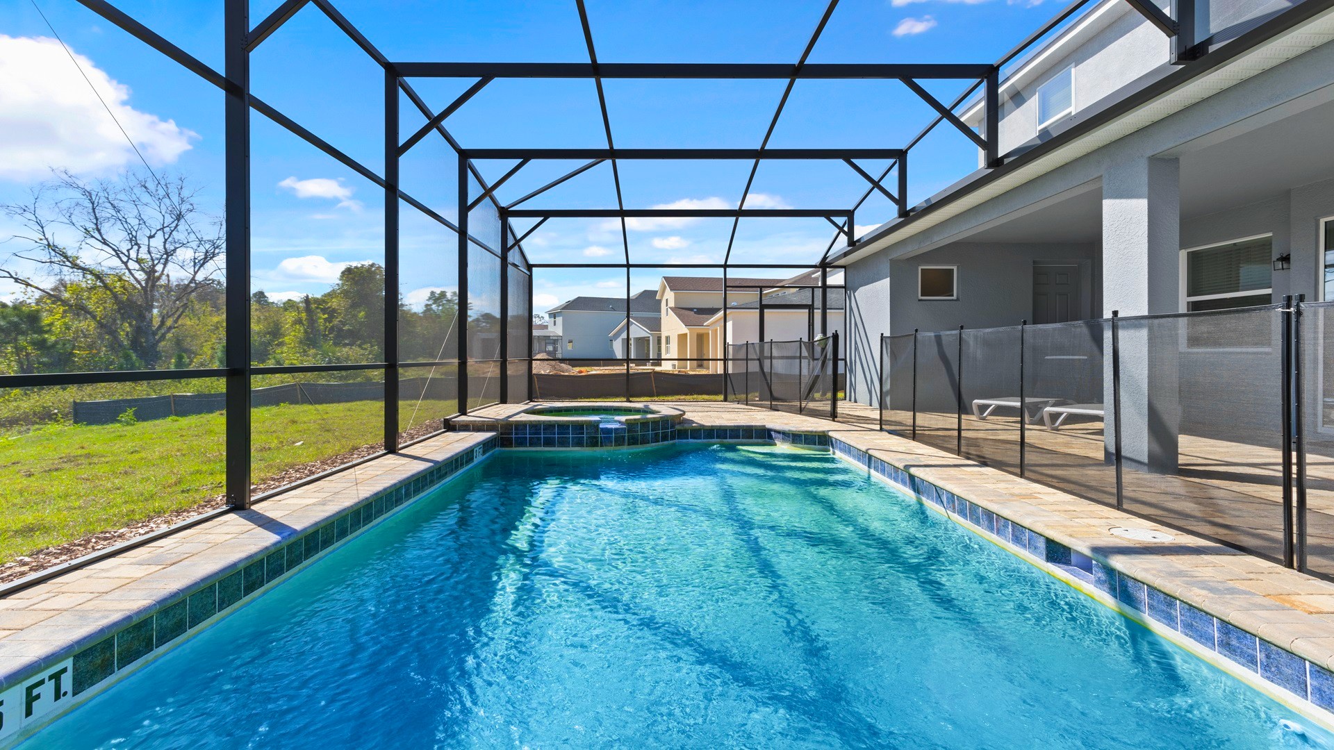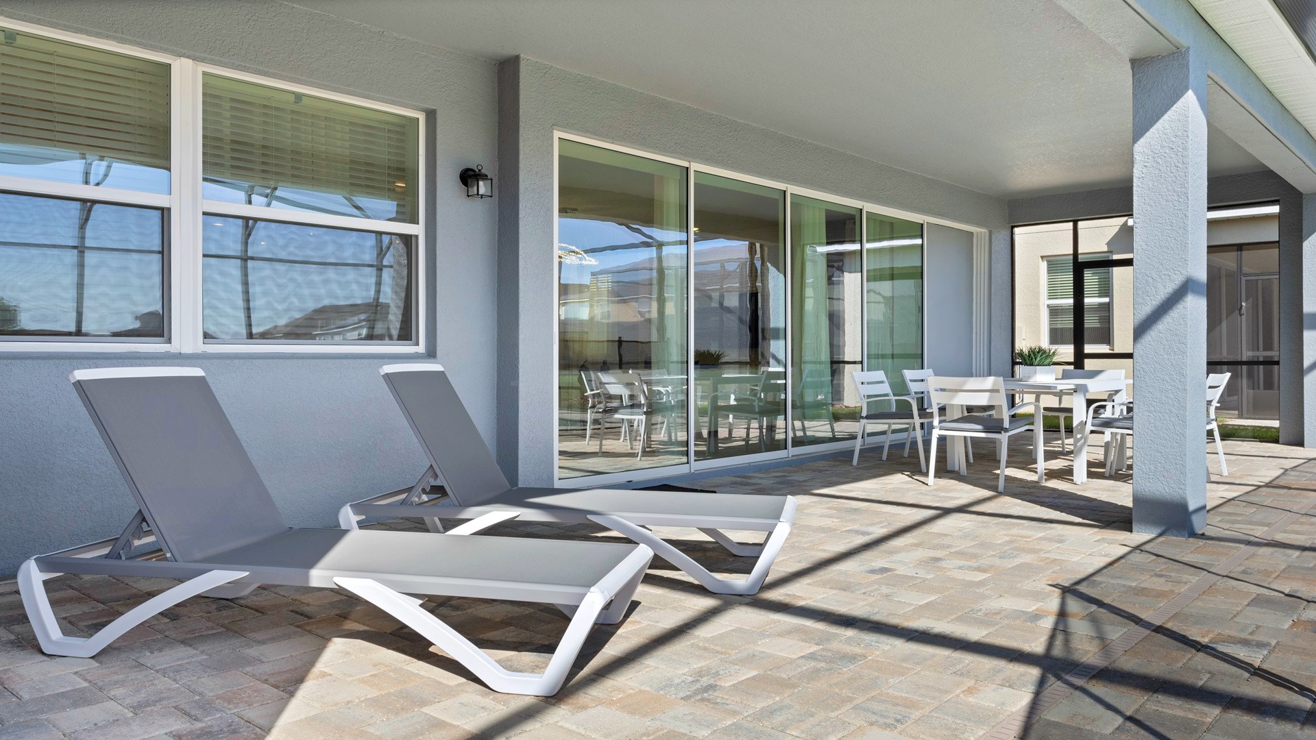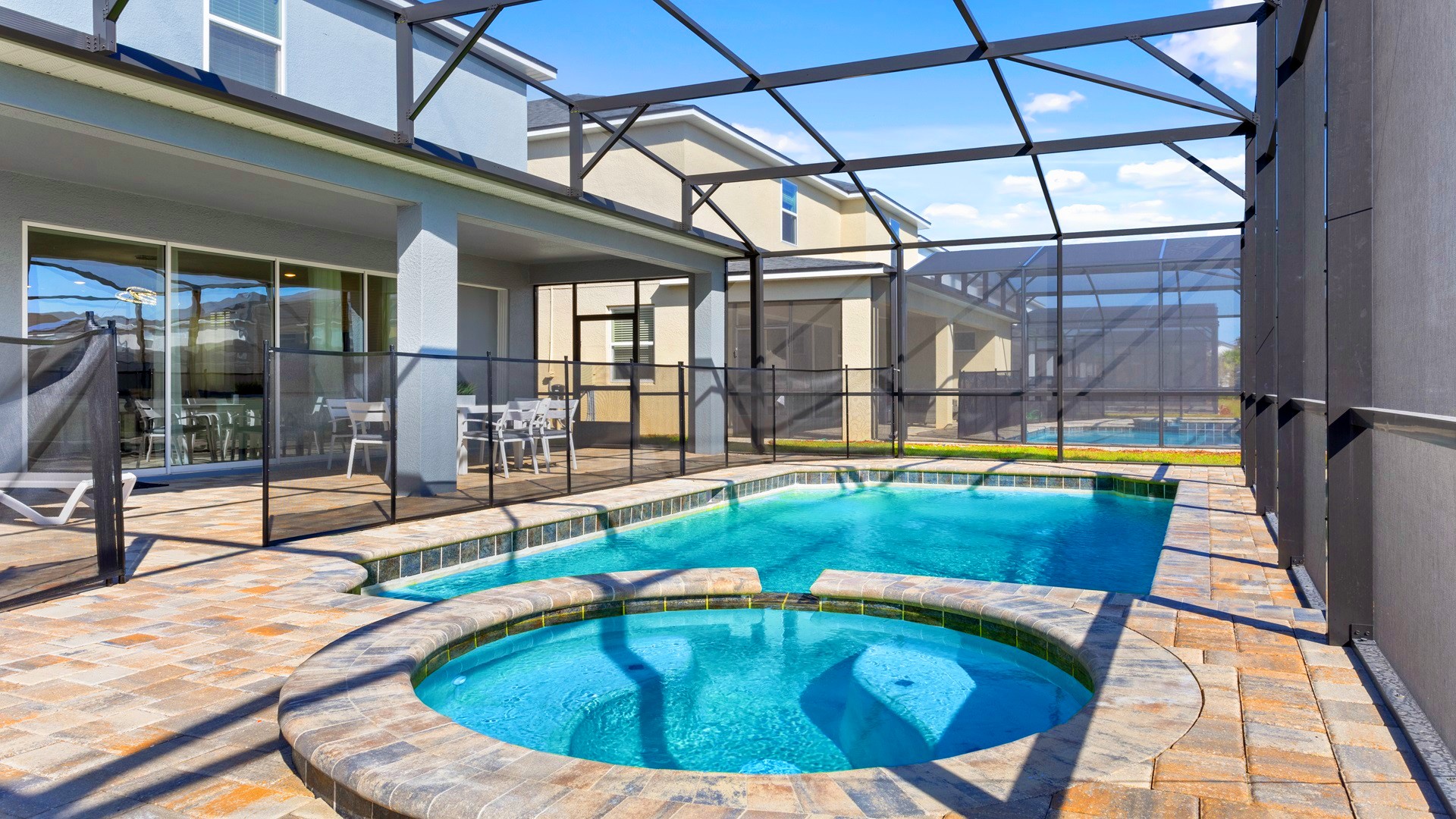 Private Pool and Spa: Screened pool area with lounge chairs and shaded seating.