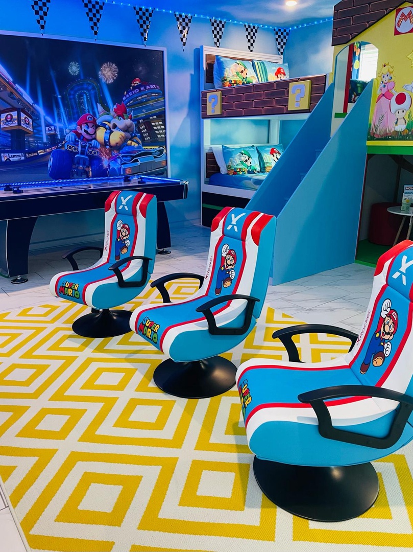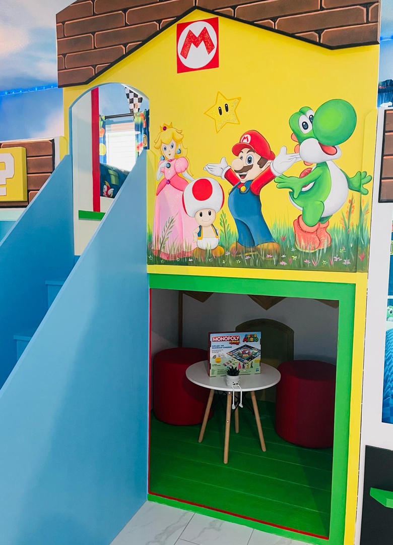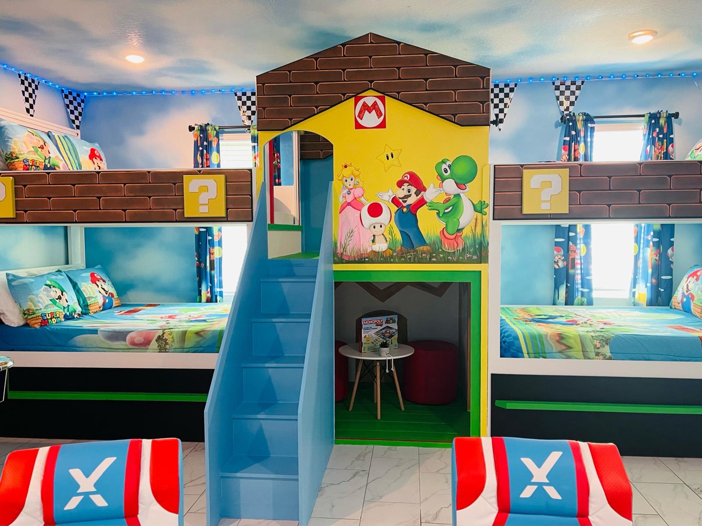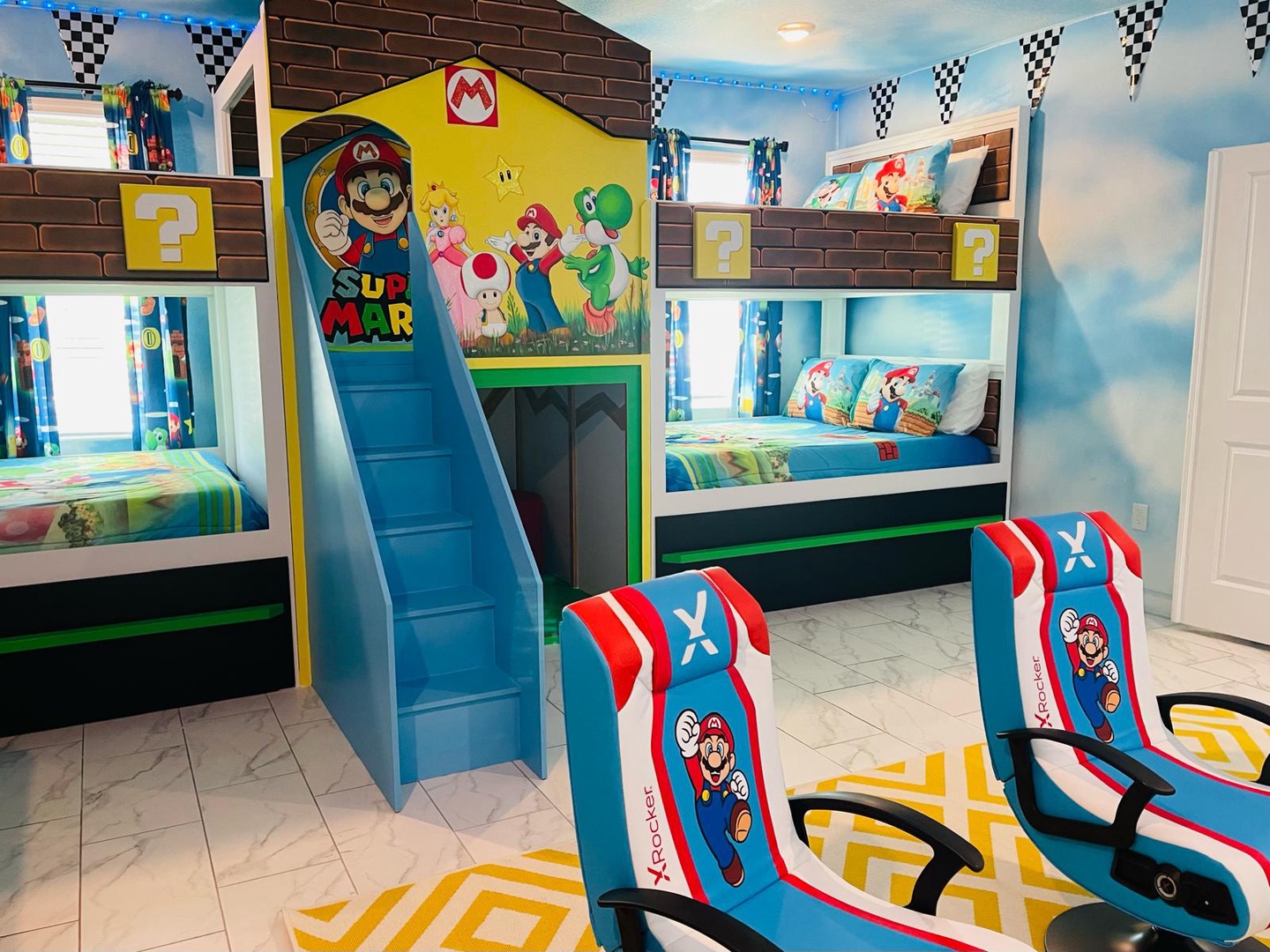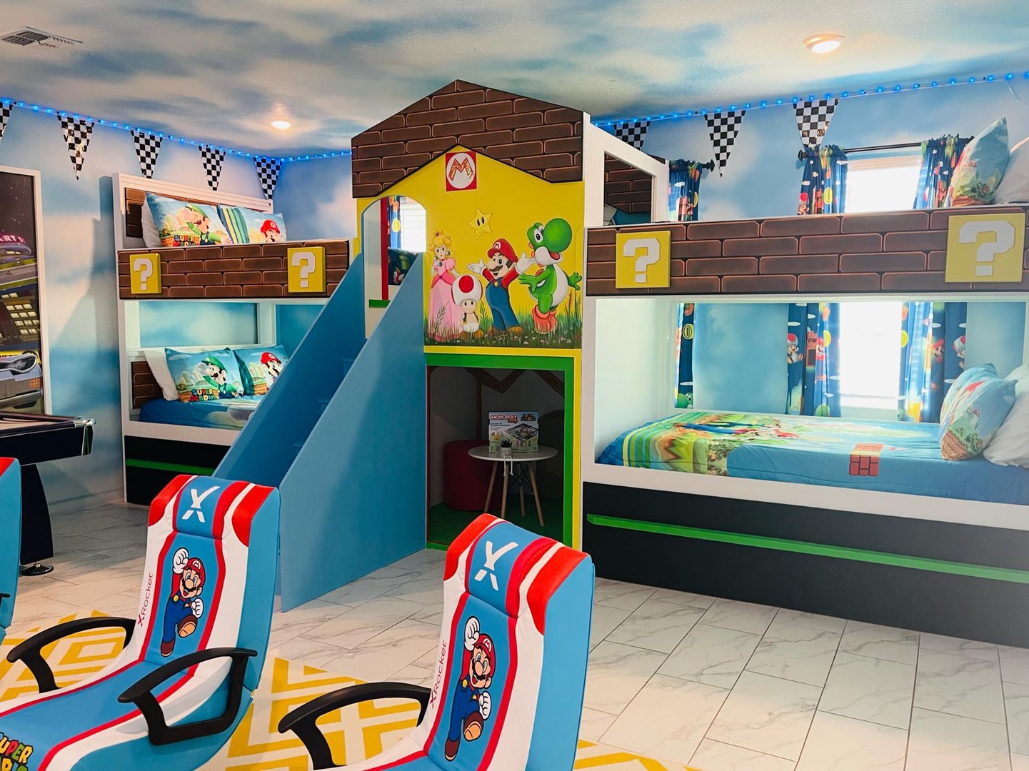 • The Super Mario Adventure Room – 4x Full-size (double) bunk beds with a slide! Perfect for groups (Sleeps up to 8).